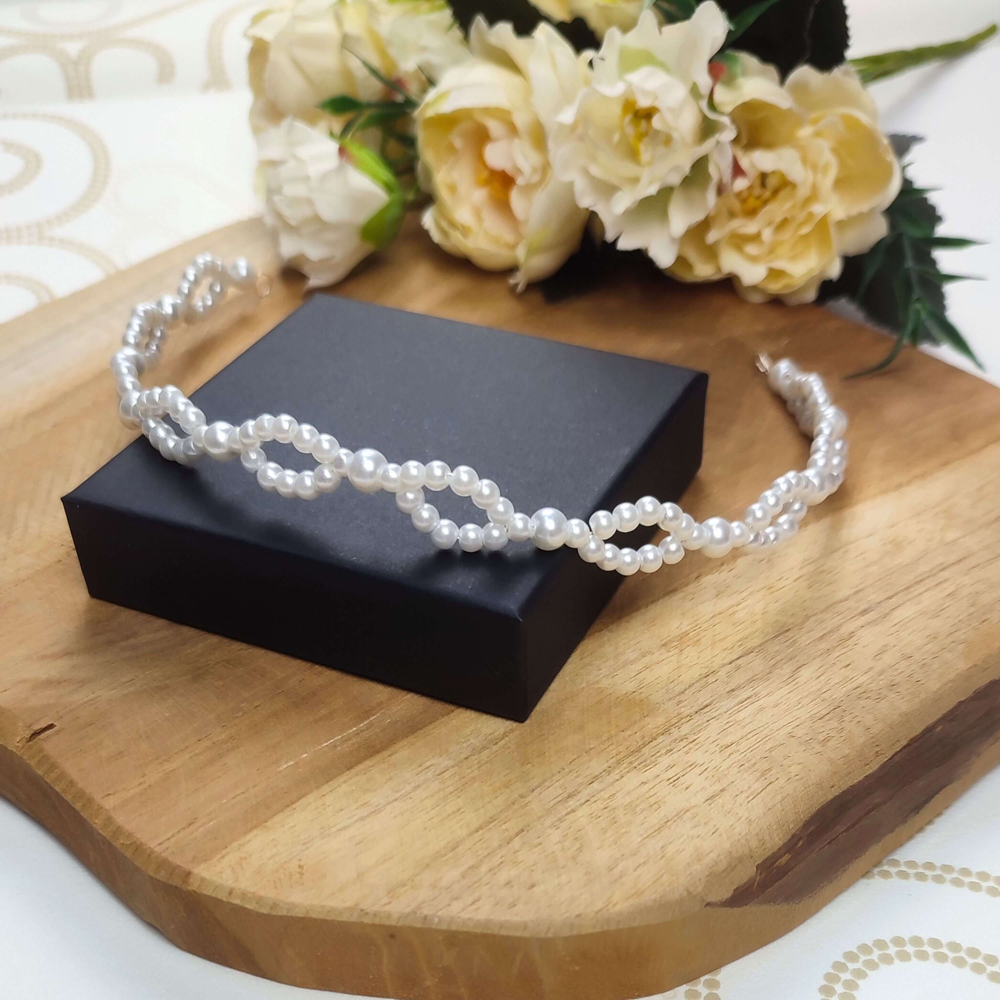 Bandeau de cheveux mariage Irma en perles nacrées présenté sur boîte noire