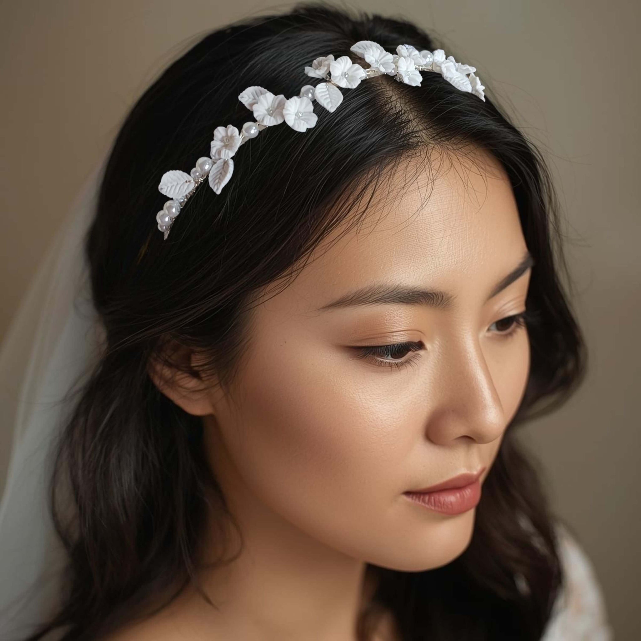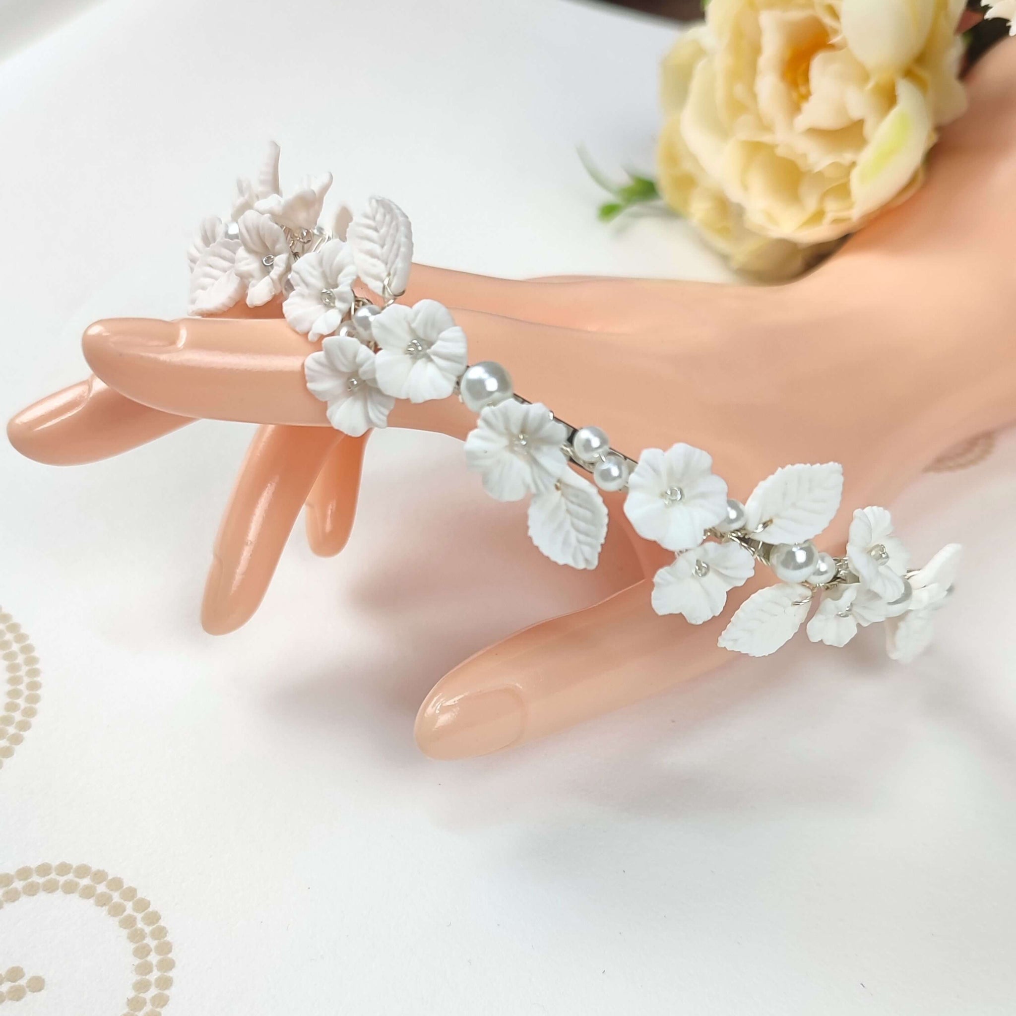 Serre-tête Lysia en porcelaine et perles, détail des fleurs et feuilles blanches sur structure rigide.