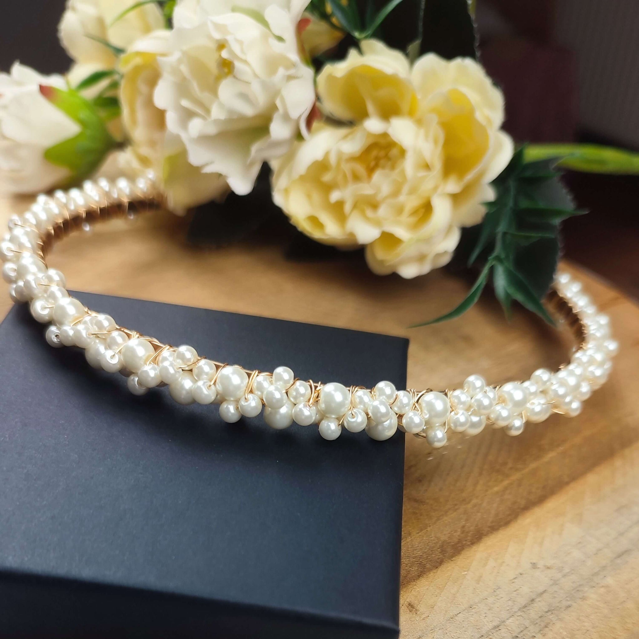 Réalisé à la main avec des perles nacrées montées sur une base rigide, il offre une tenue stable et confortable tout au long de la journée, tout en dessinant une ligne raffinée sur la coiffure.