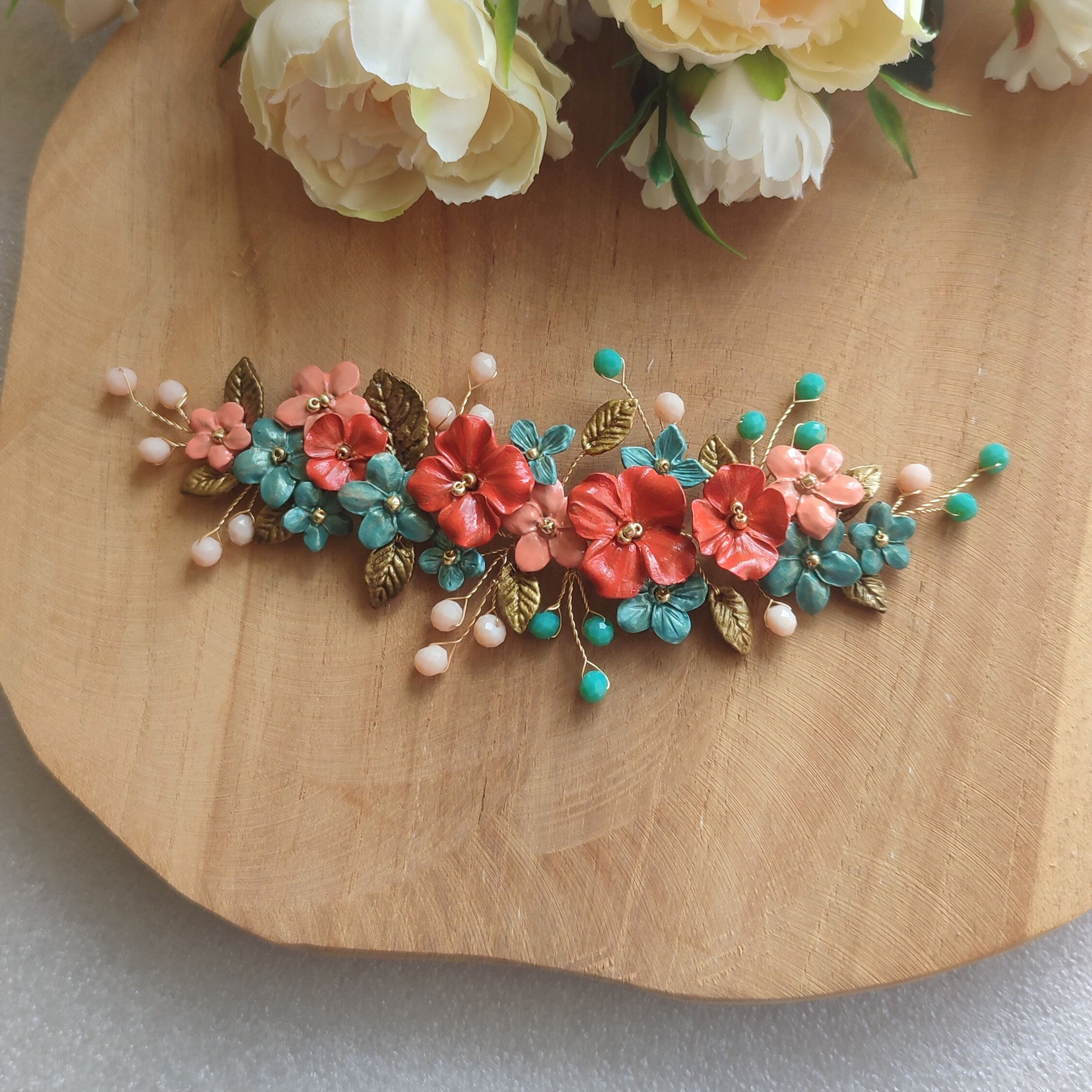 Chaque élément floral est entièrement façonné à la main et teinté dans des nuances automnales singulières. L’ensemble séduit par le contraste subtil entre les teintes chaudes et le vert bleuté des fleurs, qui apporte une touche de fraîcheur et d’originalité. Les perles crème et vert bleuté viennent illuminer l’ensemble d’éclats subtils.