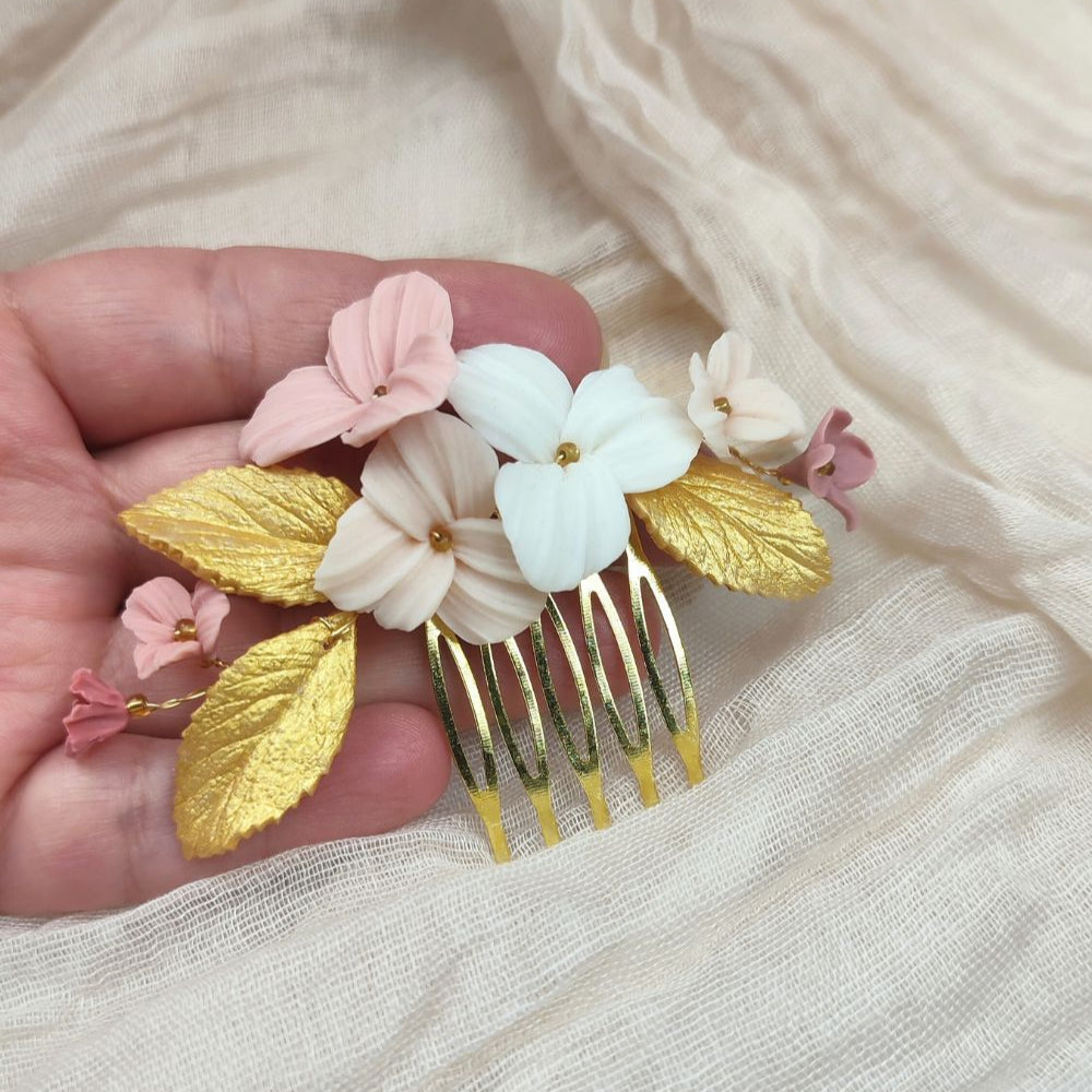 Élégant et intemporel, le peigne "Ravena" est entièrement façonné à la main en porcelaine froide. Ses fleurs délicates dans les tons rose poudré, blush et ivoire s’harmonisent avec des feuilles dorées pour une composition raffinée et poétique.